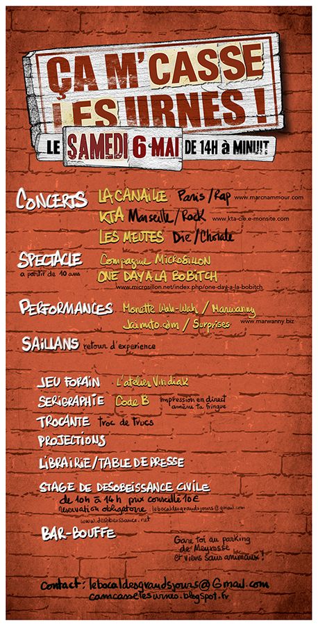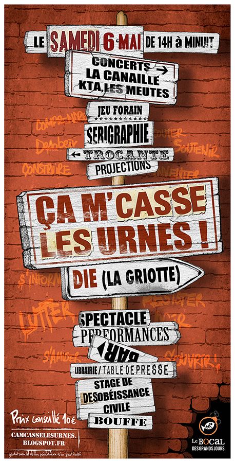 Ça me casse les urnes !Journée contre l'actuel système de représentativitéUn peu de publicité, une fois n'est pas coutume, pour la journée "Ça me casse les urnes !" à la Die (Drome), la veille du second de l'élection présidentielle. "Cette journée s'appelle CA M'CASSE LES URNES et a pour but de faire entendre la voix de celles et ceux qui pensent que ce système de représentativité est devenue une telle mascarade qu'il faut se rassembler afin de le dire haut et fort dans l'espace public. Ce système tiens par la rouille et nous valons mieux que nos sois disant représentants..."